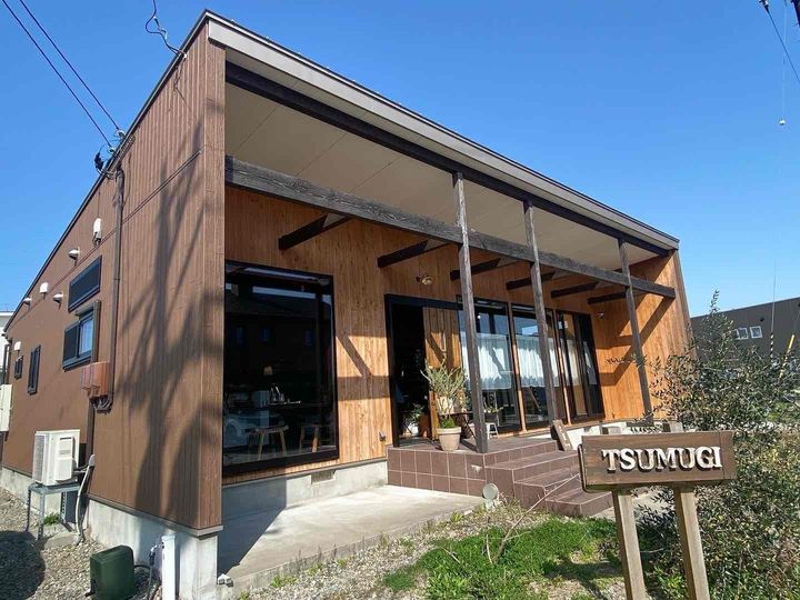 富山県高岡市の「カフェ紬麦(つむぎ)」は、オシャレな建築と「TSUMUGI」の看板が目印。2023年オープンと新しいながら、温かみを感じるウッディーなテイストがすてき!