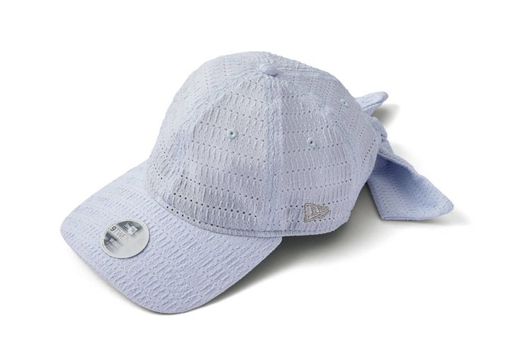 バックでクロスさせたテープの間からポニテを通せる仕様で、ヘアアレンジがキマる! クリアな白のロゴ刺しゅうで、ネイビーを軽やかな印象に。