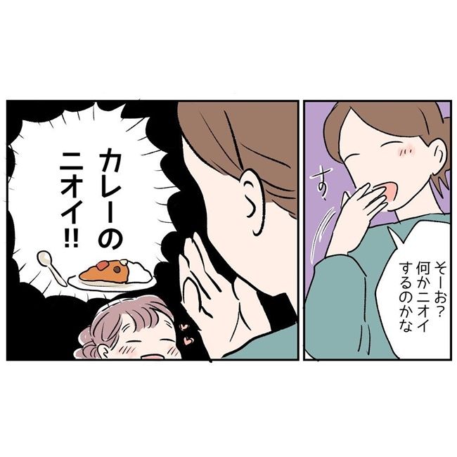 なんという大発見! 大好きなお母さんの手からは、同じく大好きなカレーのニオイ。喜ぶ次女ちゃんがかわいいですね♡