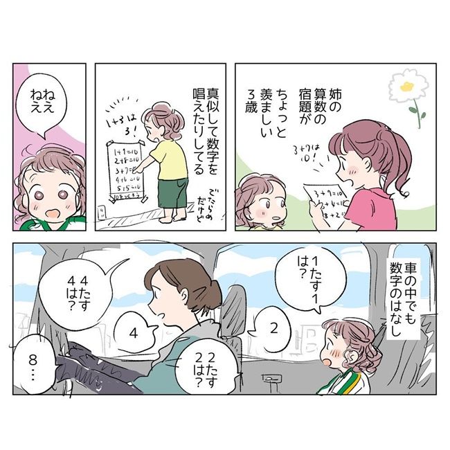 お姉ちゃんの算数の宿題が、ちょっぴりうらましい次女ちゃんは……