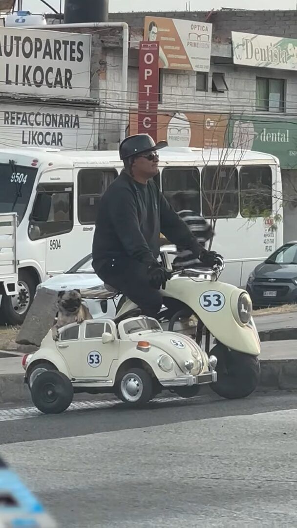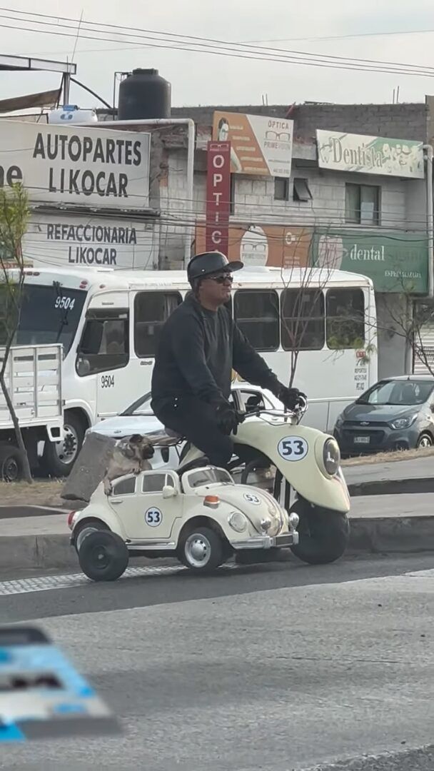 撮影者さんの視線の先には、バイクに乗った男性の姿がありました。 このバイクには、サイドカーが取り付けられていますが・・・、そこにはパグが乗っていました!!