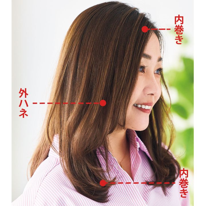 耳上の毛束の毛先のみ外ハネにすれば、前後の内巻きとのミックス感で動きのあるスタイルに仕上がります。