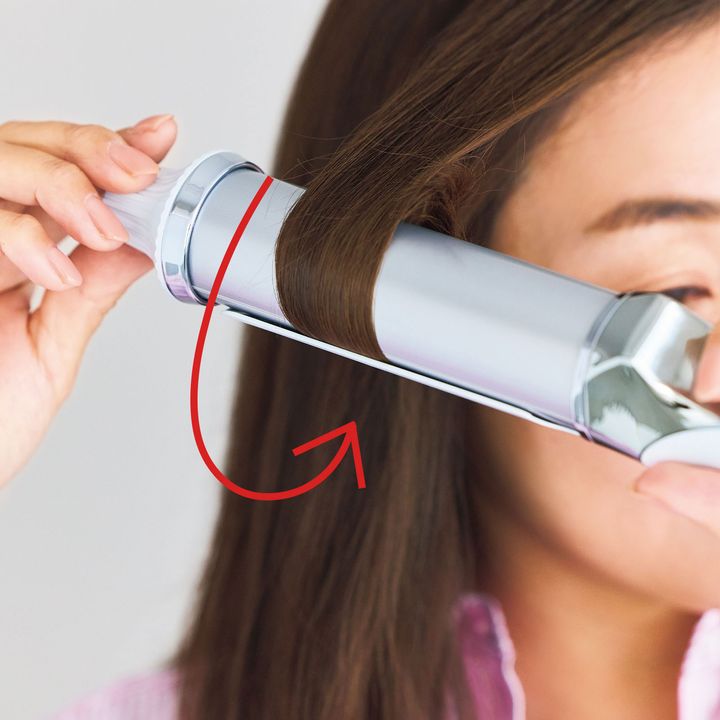 前髪の毛束をとり、中間からコテを挟んで下に滑らせ、毛先をワンカール内巻きに。全体の毛先も同様にワンカール内巻きにしていきます。