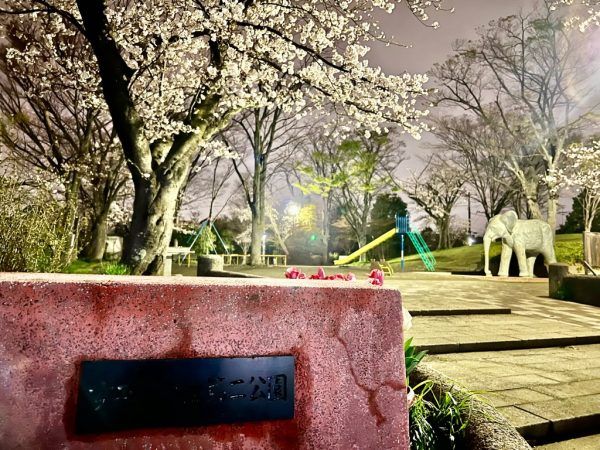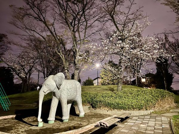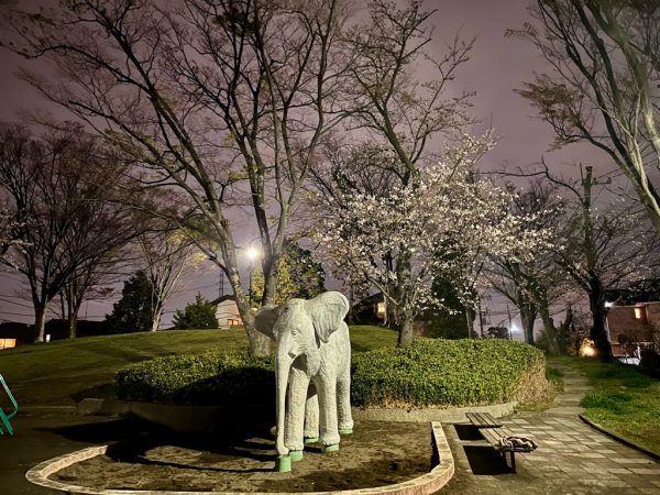 横浜市営地下鉄「中川」駅より徒歩17分くらいです 大きな像さんがライトアップしていて夜桜に映えますよ