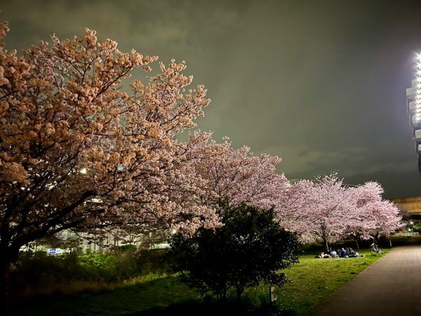 看板の照明が明るいので、レジャーシートを広げてじっくりお花見ができますよ
