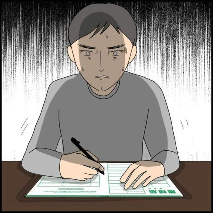 妻から催促されて、マコトは震えながら離婚届にサインをしました。