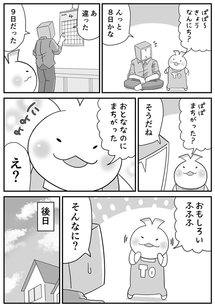 人によって受け取り方は違うと思いますが、私はマンガに描いたようなわが子の反応に頼もしさを感じました。大人が間違うことについて不安を感じたりショックを受けたりするのではなく、むしろおもしろいと感じる。のみならず、それを逆手にとるとはなかなかの策士です。