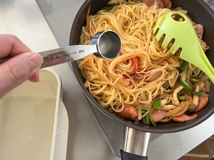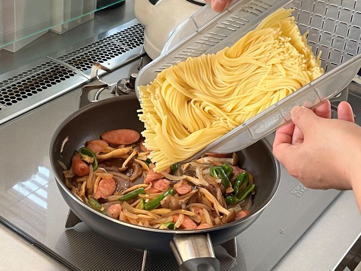 今日のメニューはナポリタンにしました。パスタを電子レンジで加熱している間、コンロと手はあいているので、パスタソースを準備したり、つけ合わせやスープを作ったりできるので助かります。具を炒めて味つけしておいたフライパンに、ゆで上がったスパゲッティを投入!