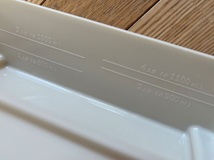 このパスタメーカーを使って、4人分のパスタをゆでてみます。本体内側の側面には必要な水分量の目印があり、その線まで水を入れます。