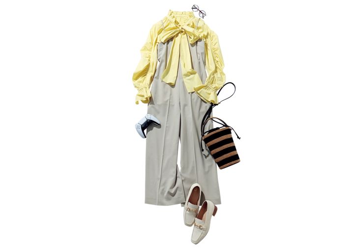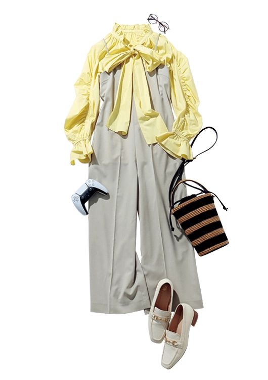 セットアップ(サロペット)¥12,980/アンフィーロ(オンワード樫山) ボウタイブラウス¥19,800/カデュネ バケツバッグ¥6,930/カシュカシュ(アンビリオン) ローファー¥17,600/Stola. メガネ¥12,000/OWNDAYS