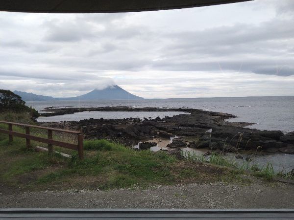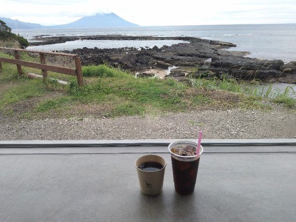 イソヒヨコーヒーの一番のポイントはこの景色!伺ったプレオープンの日はあいにくのお天気だったのですが、開聞岳を一望できます。
