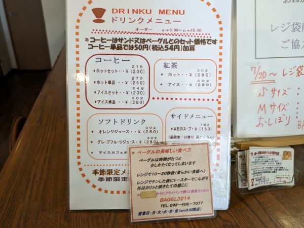 ・「Bagle3214」(ベーグル3214) ・福岡市中央区舞鶴3丁目2-14 ・(092)406-7077 ・9:00~(無くなり次第閉店) ・定休日 土・日・祝