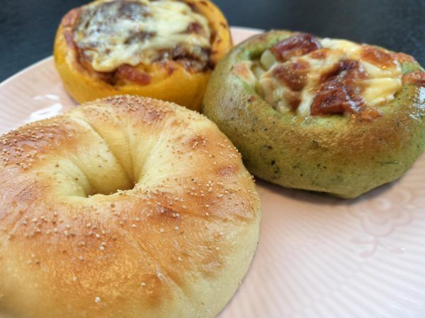 (手前から) ・いちじくクリームチーズベーグル ・アップル照焼チキンベーグル ・かぼちゃカレーベーグル