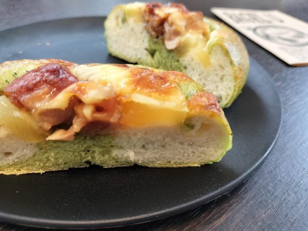 続いて「アップル照焼チキンベーグル」。ホウレン草生地だそうです。