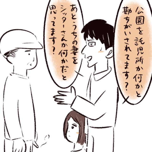まるさんやアキくんがどれだけおーちゃんに迷惑しているかをやつれさんが伝えても、全く話の通じないおーちゃんの父親。呆れたやつれさんが「あなたが娘さんと遊んでくれさえすればもういいです!」と言うと、「男親が公園で娘と遊ぶなんてことはない」「母親の方が子どもと遊ぶのは得意」「自分の子の他に小さい子1人増えたくらい別に・・・」と理解不能な主張を連発。挙句の果てに「一緒に遊んでやって下さい」と堂々と言ってきて・・・。