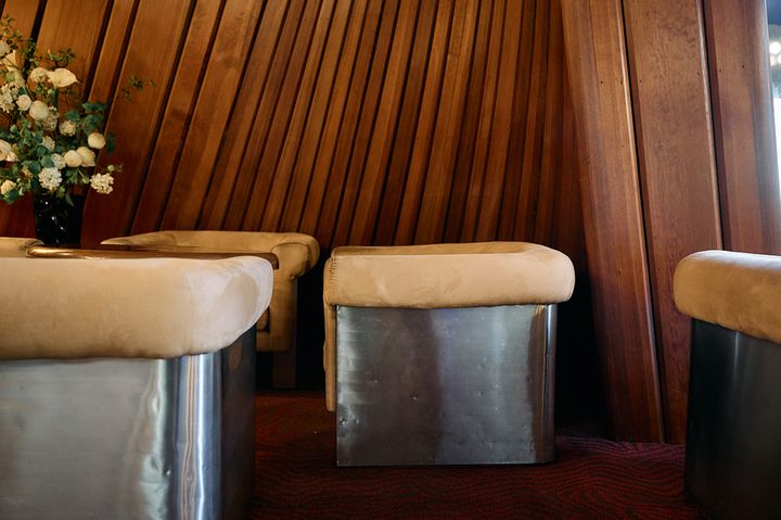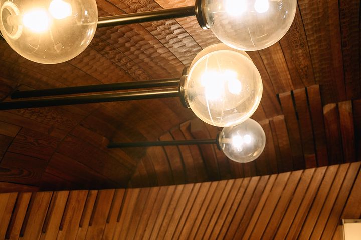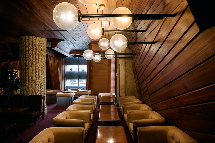 2階へ上がって訪れたのは〈ぎおん石 喫茶室〉。セピアに煌めく空間は船室をイメージして作られており、洗練された高級感で満ちています。漂うように灯されたガラス玉のランプは、太陽の日差しに照らされた波の気泡のよう。