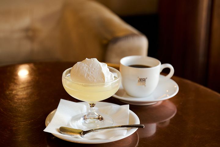 訪れたら一度はいただきたい、レモンゼリーホットコーヒーのセット。その見た目の上品さとは裏腹にレモン1.5~2個分の果汁を贅沢に使用した、しっかりとパンチのあるゼリーです。街歩きでくたびれた身体もシャッキリ。すかさず生クリームの甘さが、酸味を優しく包んでちょうど良いバランス。苦味の深いコーヒーは「ぎおん石 喫茶室特別ブレンド」のものです。