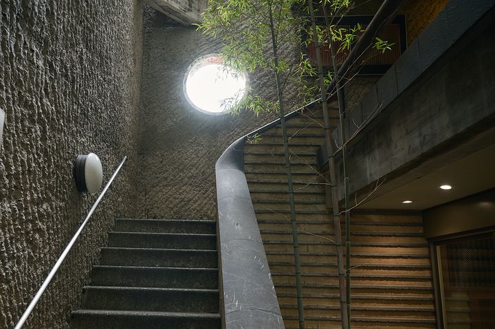 ヒノキの無垢材に覆われた壁は、天井にかけてゆったりとカーブ。店内奥の天井は海底から見上げる水面のような名栗加工がされており、海面のプリズムを思わせるようなこだわったつくりです。空間を支える小石が散りばめられたコンクリートの柱は、職人さんが手作業で彫り出されたものなのだとか。