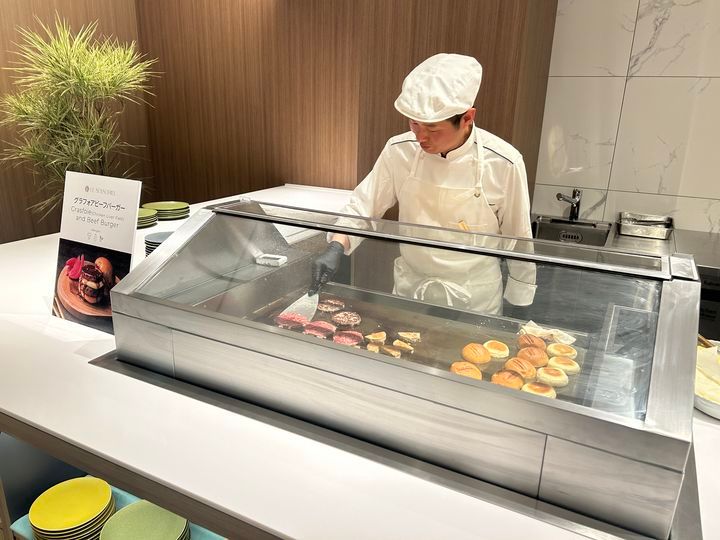 その他、目の前で調理していただけるライブキッチンも充実。「搾りたてモンブラン」「鶏レバーを使った作りたてハンバーガー」、朝の時間は「パンケーキ」「エッグベネディクトなどを出来立てでいただくことができますよ◎