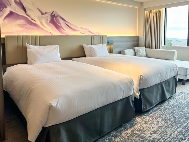 客室は広々としたスーペリアツイン(36㎡)のお部屋を数多く展開。八ヶ岳や南アルプスを客室から眺めることができる贅沢な作りとなっていますよ!客室のベットボード側には、山梨に伝わる革工芸品「甲州印伝」から着想を得た八ヶ岳のアートが描かれているのもおしゃれなポイントです。
