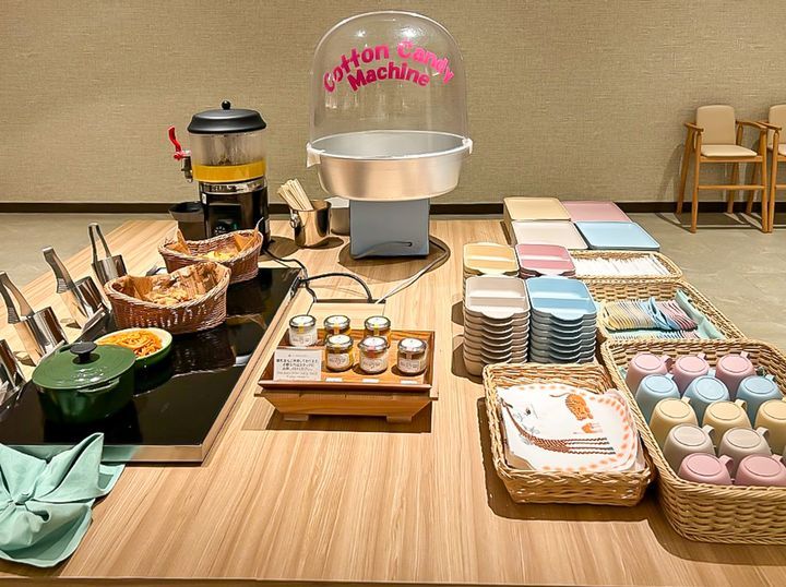 子ども用の食事にも、嬉しい心遣いがいっぱい♪子どもたち自身がビュッフェを楽しめるよう、取りやすい高さに設計されたテーブルの上に、専用のカトラリーや子どもが好きなポテトフライなどのおかずや、自分で作れるわたあめ機などが充実。