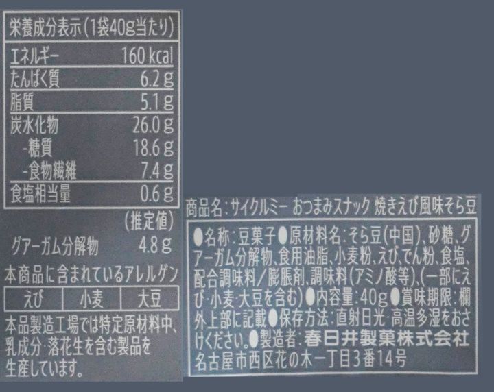 次にご紹介するのは「サイクルミー おつまみスナック 焼きえび風味 そら豆」1袋40g 213円。