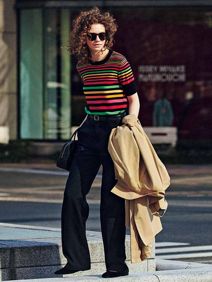 スタンダードな黒パンツにヴィヴィッドなボーダートップスをON。「装飾性は柄だけ」とした潔いコーディネートだから、ボーダーの多彩さとパンツのミニマルさがそれぞれ生きる形に。