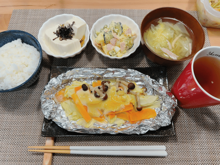 鮭のみそマヨホイル焼き/塩こんぶ奴/ポテトサラダ/キャベツスープ