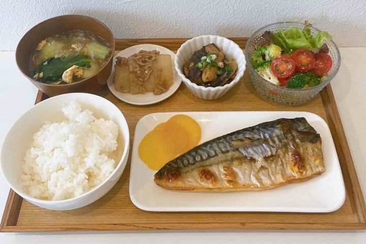 鯖の塩焼き/大根そぼろ煮/なす炒め/ブロッコリーとトマトのごま和え/青梗菜と春雨の中華スープ