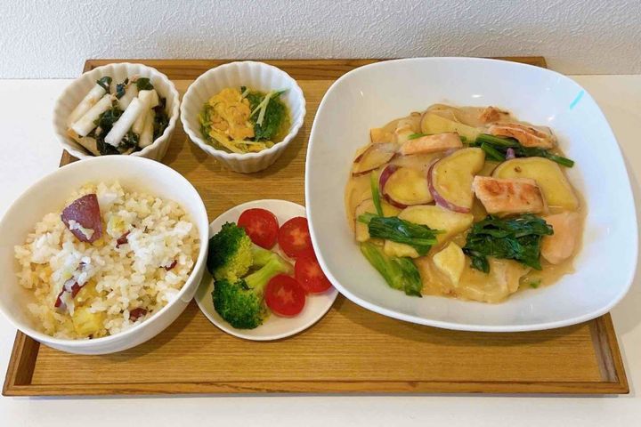 鮭とさつまいも、ほうれん草のクリーム煮/大根サラダ/水菜の卵とじ/ブロッコリー、トマト/さつまいもご飯