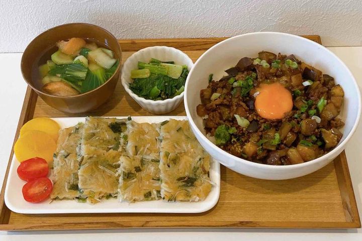 なすとひき肉のスタミナ丼/チヂミ/小松菜のおひたし/青梗菜と桜えびのスープ