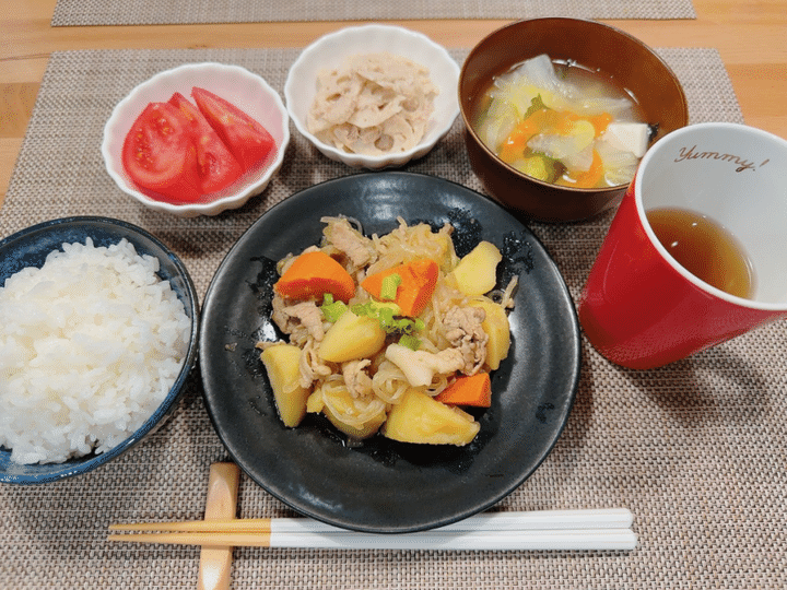 肉じゃがには、お買い得な豚こま切れ肉を使用。白滝も加えてボリューミーに。