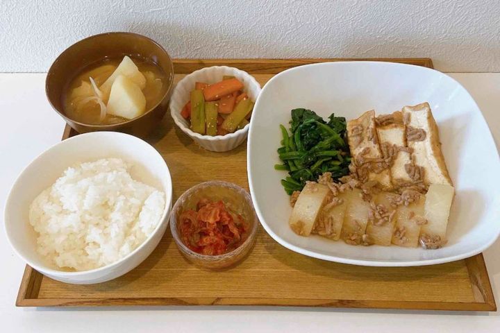 大根と厚揚げのそぼろ煮/ブロッコリーの茎とにんじんのきんぴら/キムチ/じゃがいものみそ汁