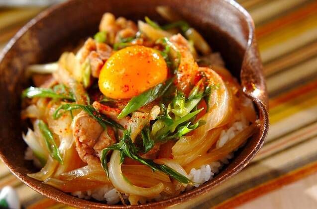 ニンニクとショウガを効かせたしょうゆダレで豚肉と玉ネギを炒め煮した「スタ丼」が手軽に15分で作れます。黄身を崩す瞬間がたまりません。