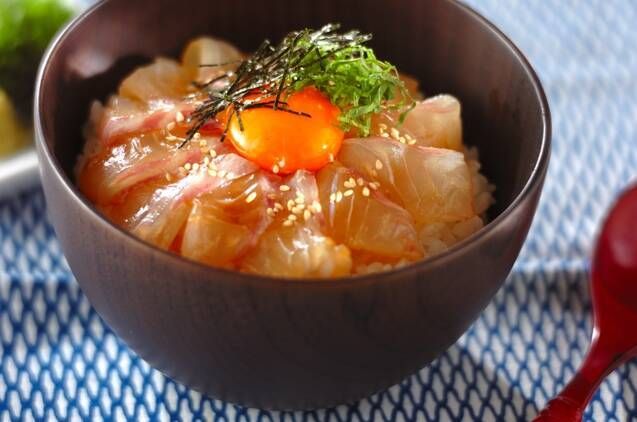 肉系が多い丼ランキングですが、愛媛県宇和島名産の鯛めし丼も忘れてはなりません。薬味をたっぷり乗せて、卵黄をくずして食べてください。