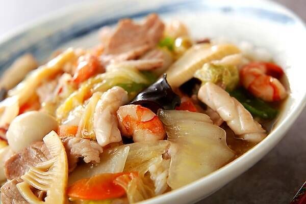 白菜や水煮のタケノコをはじめ、エビ・イカ・豚肉とたっぷりの具材が入った中華丼は、一皿で栄養バランスばっちりです。中華丼のあんかけは焼きそばに乗せたり、ラーメンに乗せたりアレンジが効くので覚えておくと便利です。