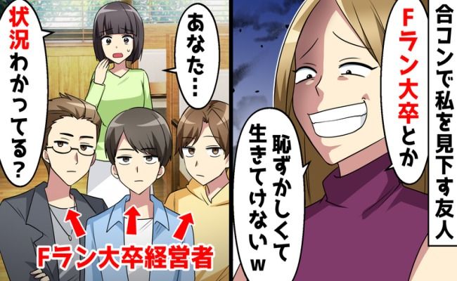 同級生Yは、男性たちの前でもお構いなく「聞いてくださいよ! この子、Fラン大卒なんですよ? どう思います?」と私をばかにします。しかし、男性たちは「大学なんてどこだって関係ないよ。それよりもどう生きるかのほうが重要でしょ?」と同調しません。それもそのはずです。同級生Yが来る前に私たちは自己紹介を済ませたのですが、男性たちはみんなFラン大を卒業し、努力して経営者になったという経歴を持っているのです。