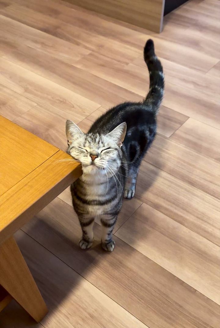 テーブルの角でスリスリ。ご満悦な猫がかわいすぎると話題に!「見てるこちらも幸せになれる」「画角がいい」