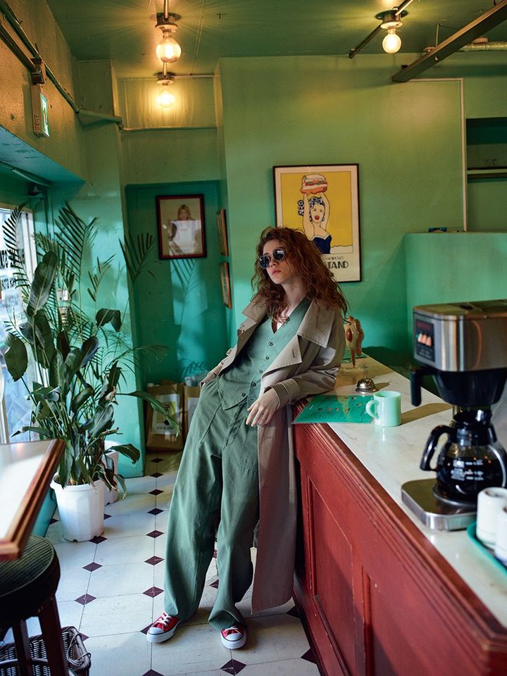 カーキベスト 41,800円、カーキワイドパンツ 47,300円/ともにマディソンブルー 共布ベルトつきベージュトレンチコート 95,480円/Oblada(シンチ) サングラス 52,800円/EYEVAN(アイヴァン 東京ギャラリー) スニーカー 6,380円/コンバース(コンバースインフォメーションセンター) オーガニックコットンを使用。