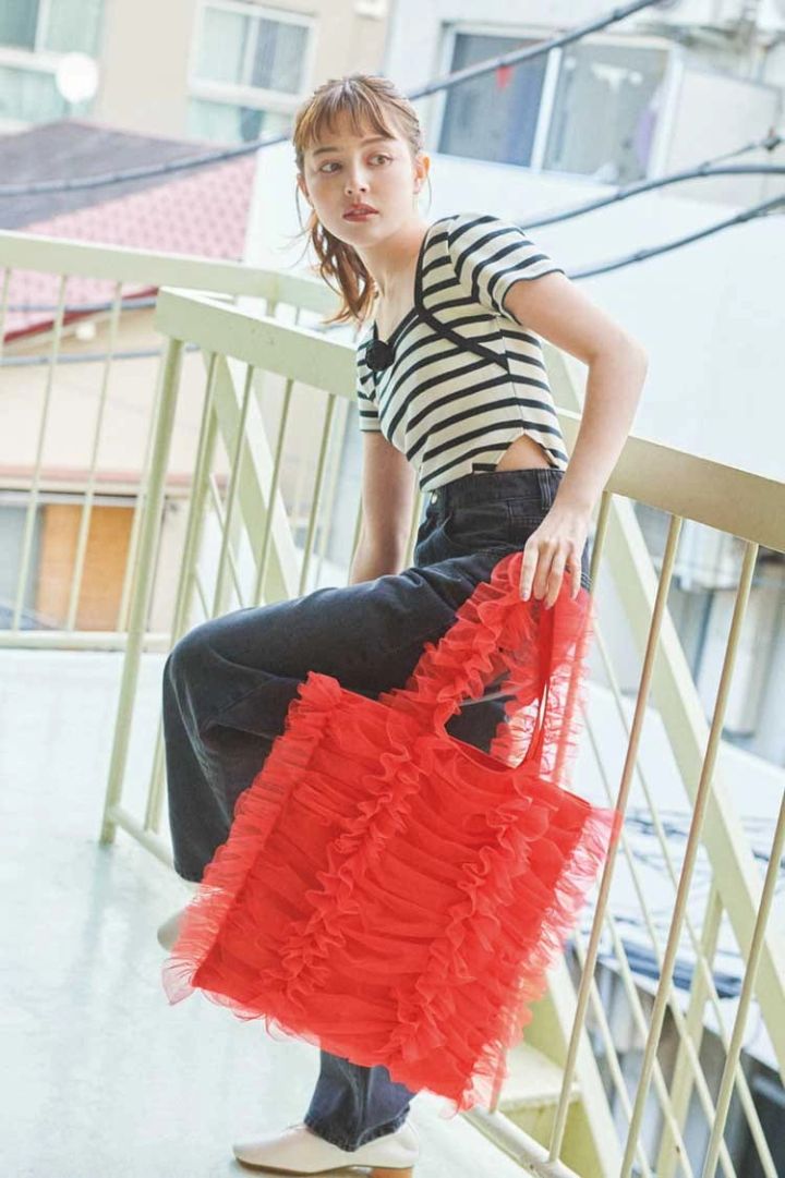 赤チュールトートバッグ 8,250円/キャセリーニ バラつきボーダートップス 7,980円、黒デニムパンツ 12,880円/ともにépine バレエシューズ 17,050円/moumoune