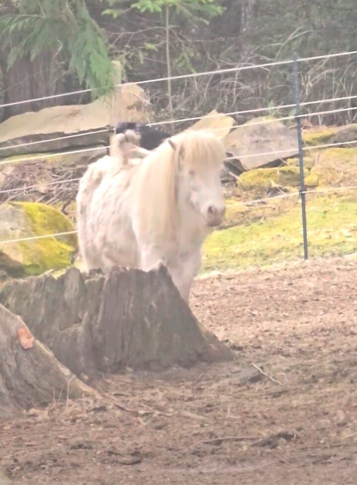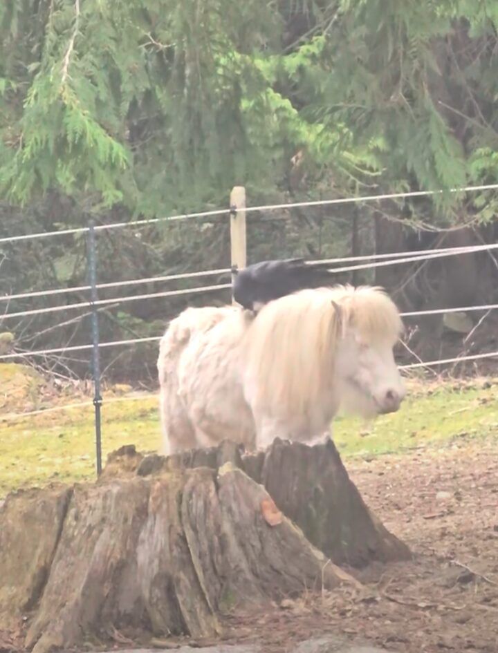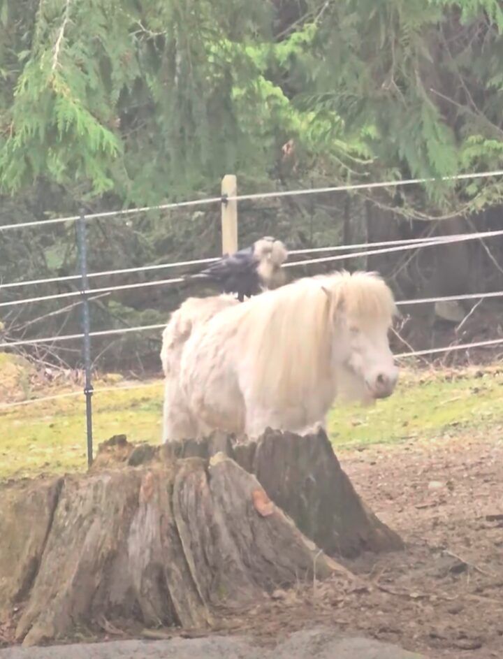 カメラは、白いたてがみをした馬の姿を捉えています。 その背中にはカラスの姿があるのが確認できます。