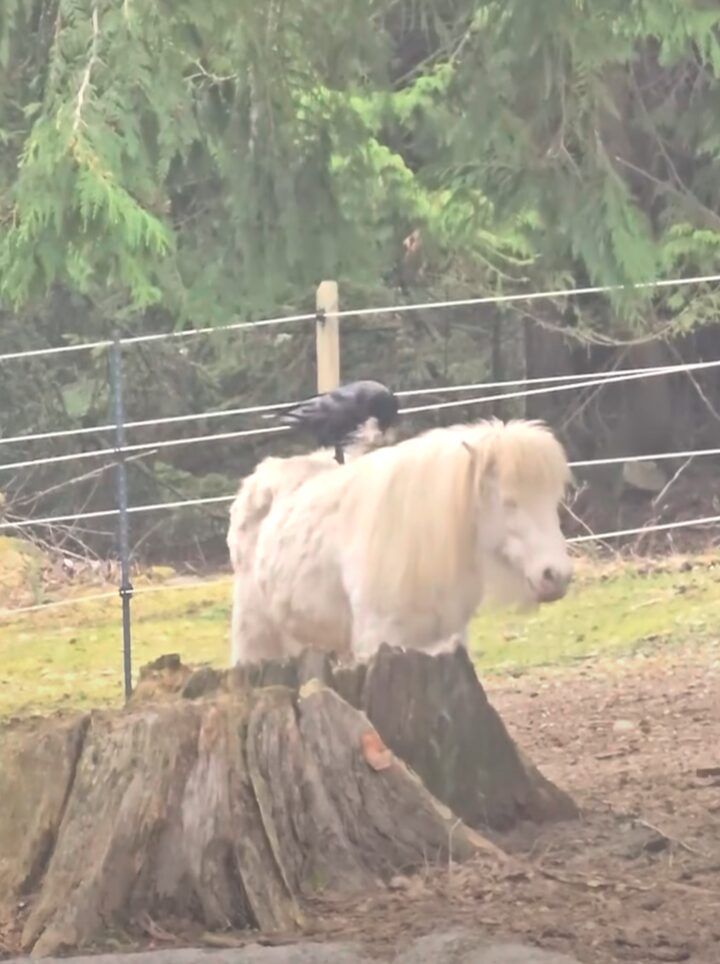 馬の背中に乗っているカラス。 夢中でその毛を引っ張っていますが・・・、悪いイタズラをしているというのでしょうか!?