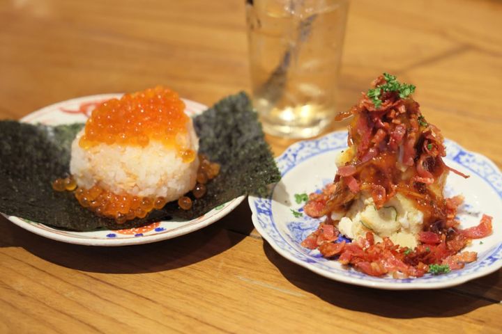 黄金生姜とベーコンのポテサラ(¥780) いくらと焼鮭のおにぎり(¥900)