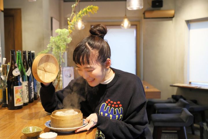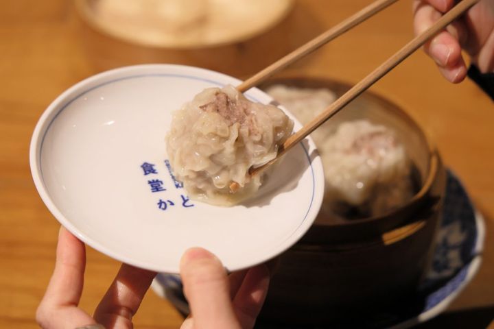 肉汁たっぷり。ほかほかの湯気で出てくる肉焼売も人気。ポン酢とからしでいただきます。