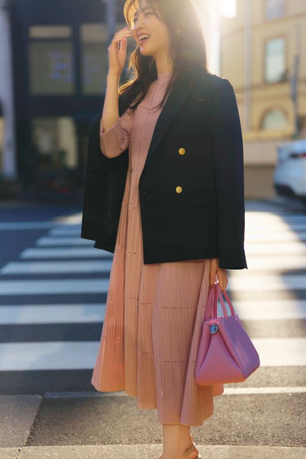 1枚で着ると甘すぎる印象のピンクワンピも、ネイビージャケットを肩がけすればキリッと仕事モードに仕上がります。ワンピに添えるバッグもピンクでそろえ、春爛漫のムードに。