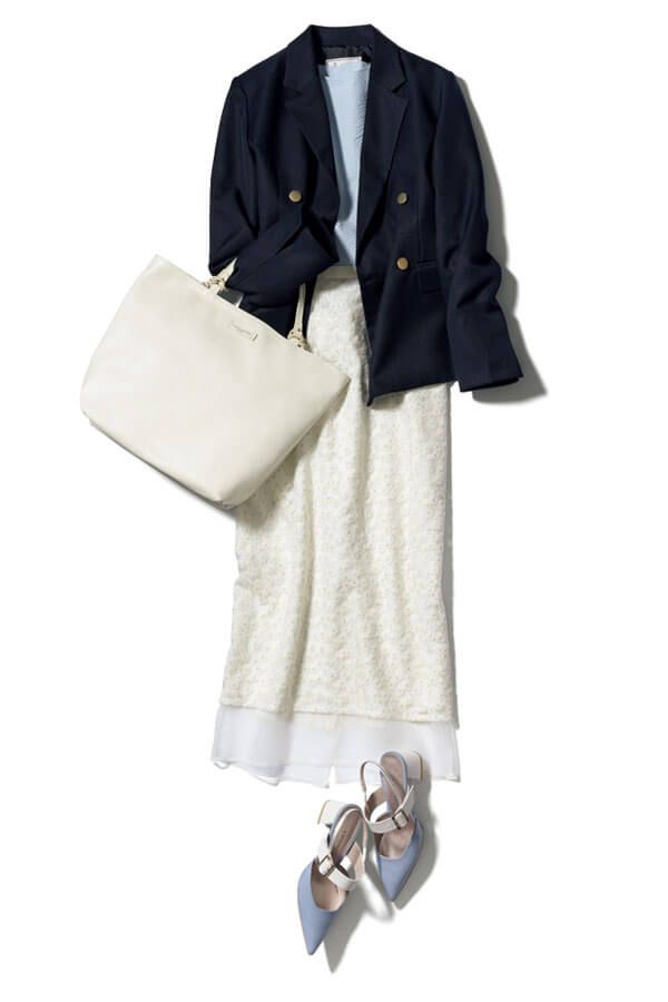 お仕事で相手の信頼を得たいときに大事なのは、知的さと清潔感。ジャケットのネイビーを×白でスッキリと軽やかに導いたところに、淡いブルーを差すとびきりクリーンな配色に!