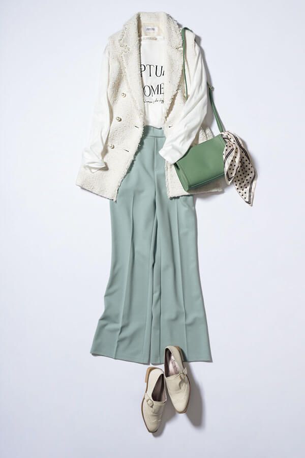 きれい色パンツをおしゃれに着るなら、カジュアルなロゴT×かっちりジレでおめかし顔に。ツイードとミントカラーが織りなす南仏風のさわやかさは休日コーデにぴったり!