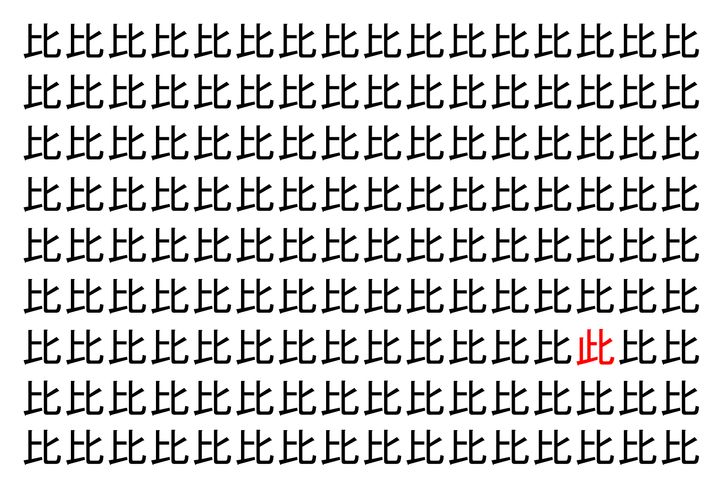 画像の中には、「比」という漢字が縦に9行、横に16個並んでいます。 全部で144個となりますが・・・、そのうち1つは「異なる漢字」となってますよ!!
