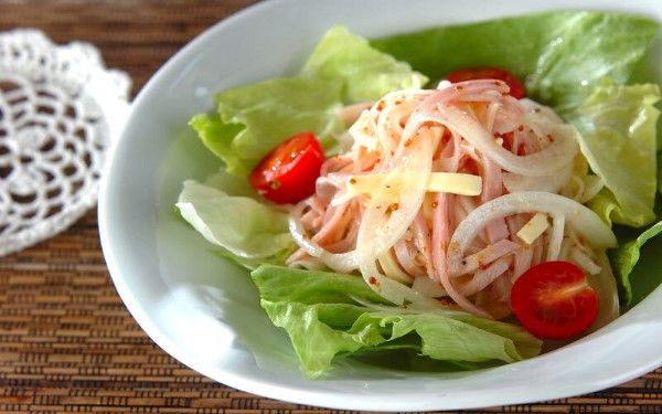 新玉ネギ、ハム、スライスチーズをせん切りにして、ハニーマスタードドレッシングで和えます。甘味のある新玉ネギに、各食材のコクや旨味がプラスされて美味です。レタスの上に盛り、プチトマトを添えると華やかですね。