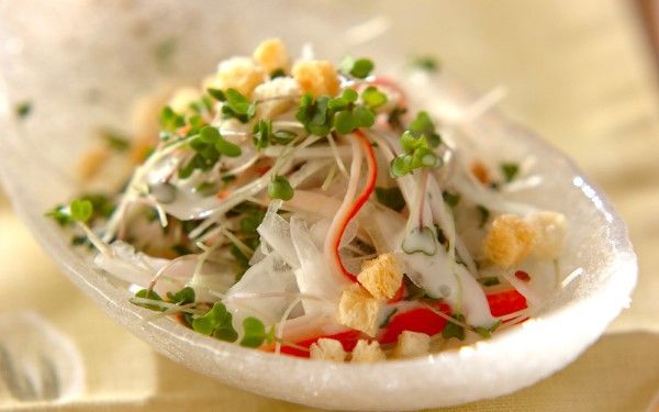 新玉ネギを縦薄切りにして、シャキシャキの口当たりに仕上げます。スプラウトとカニカマを合わせることで、色合いも鮮やかに。ドレッシングはお好みのものでどうぞ。